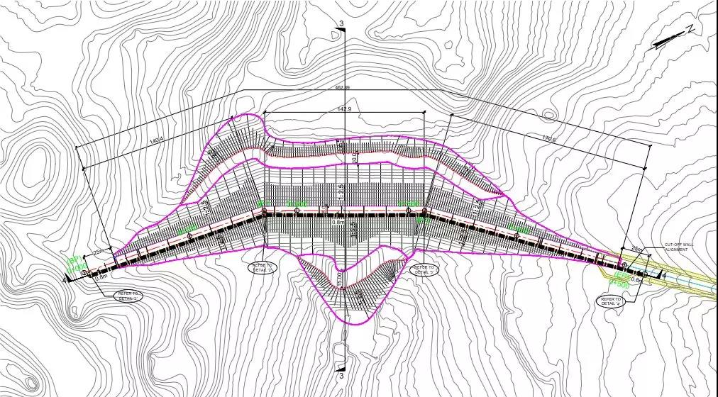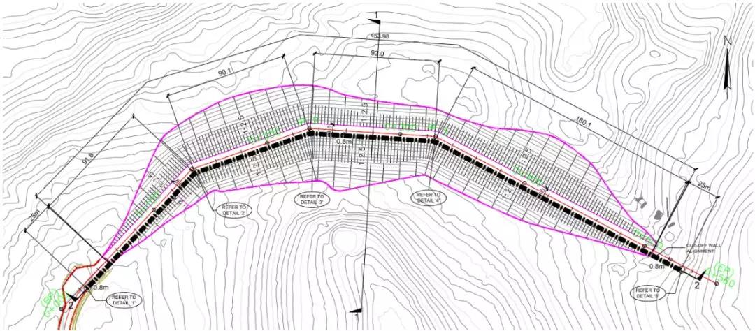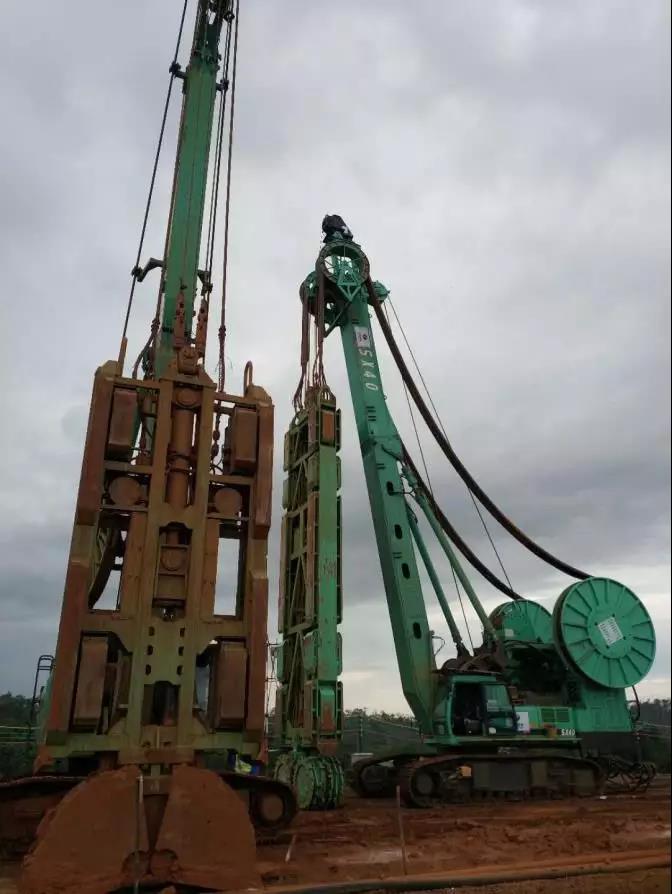 此工程两个主坝区分别为DAM E和DAM F,设计工程量分为防渗墙27,800立方米,抗滑桩146根,降压井657口。其中防渗墙部分由我司抓斗SG50A及双轮铣SX40A进行施工。该防渗墙,DAM E 为74副槽,DAM F 为76副槽。 槽宽1米,深度25-35米。一期槽段采用抓铣结合,二期槽槽采用套铣结合方式施工。抓斗SG50A抓至20-34米不等,双轮铣SX40A 入岩 0.4-1米不等,个别槽段入岩7米。截至目前设备安全、稳定、可靠,施工效率平均1.5副/天。由于事先金泰公司与用户进行了深入沟通和了解,设备选型准确,符合当地施工条件。因此施工效率完全符合用户要求,得到了用户与相关国家的充分认可。
