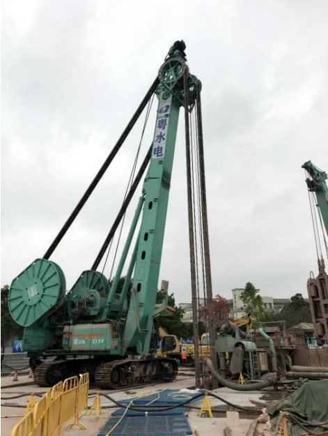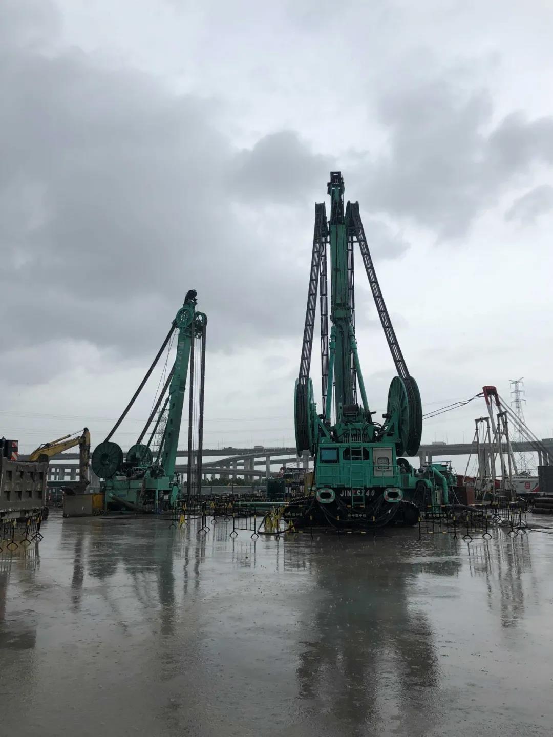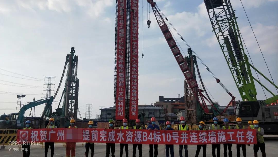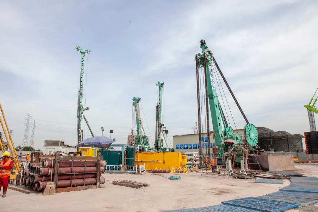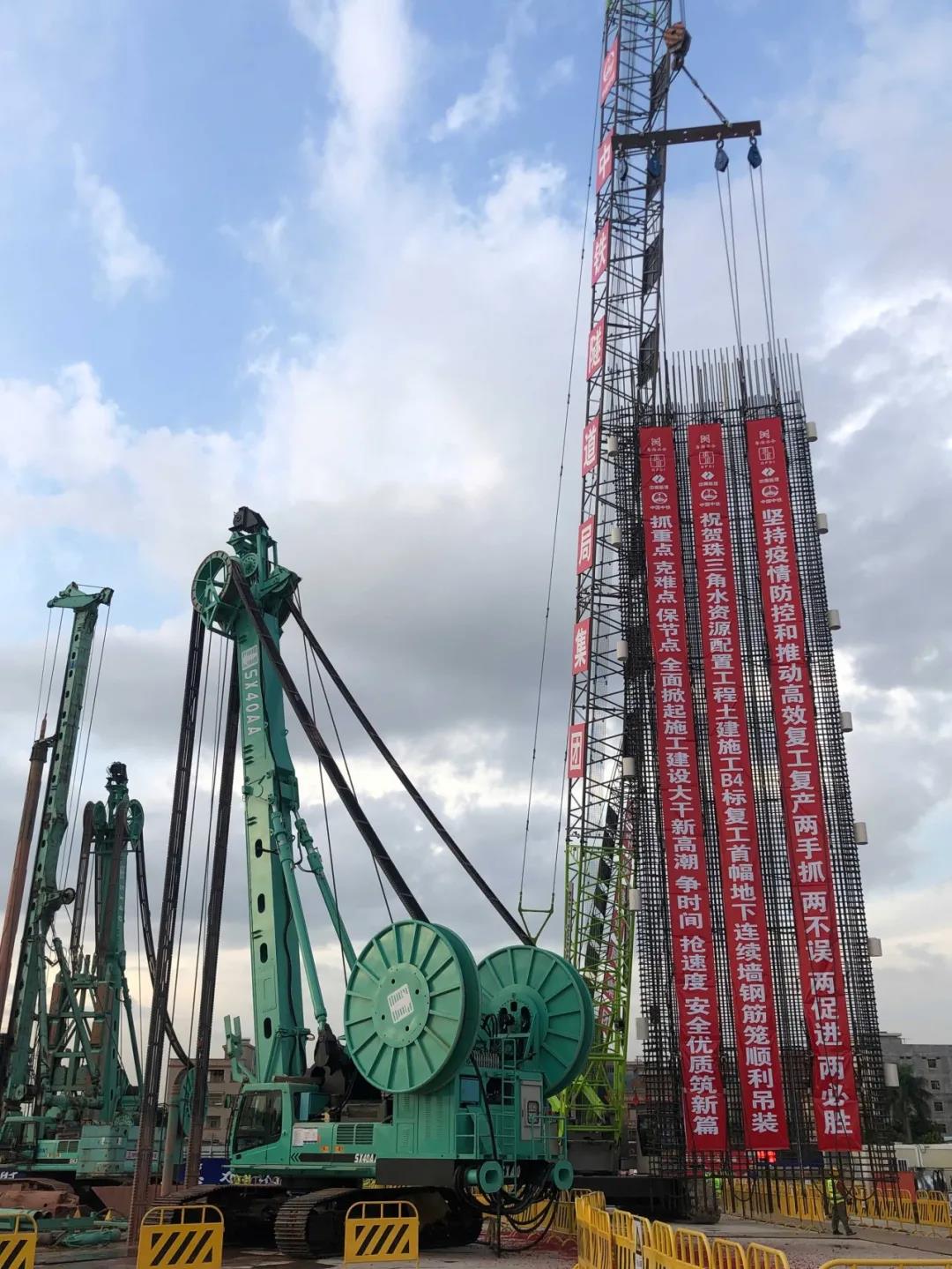 水资源项目连续墙施工主要配备双轮铣槽机、旋挖钻机、成槽机等设备。其中,被誉为桩工机械家族“奢侈品”的双轮铣,作为目前国际上先进的地下连续墙施工专用设备,通过更换不同类型的刀具即可在不同硬度地质中开挖。铣槽机在复杂地层条件下的施工效率高、精度高、适应性强,而且对环境影响和污染小,在该项目中被确定为主力设备,并投入数十台。施工中,中外品牌同台竞技争奇斗艳,场面蔚为壮观,其中5台金泰双轮铣设备在项目中同时开展施工,SD03#工作井便是上海金泰SX50双轮铣的杰作,钢筋笼需沉槽到地下78米处,是上海金泰在珠三角区域最深的地下连续墙,也是在广州做得最深的地下连续墙。