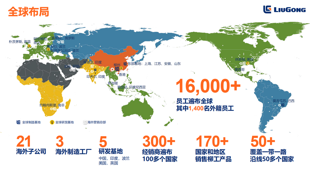 柳工在国际化领域处在行业的领先地位,全球拥有16000多名员工,300多家经销商、30家海外子公司和机构、5个全球研发基地,产品远销170多个国家和地区,国际业务覆盖“一带一路”沿线85%的国家。近年来,柳工海外市场保持高速增长态势。新冠疫情期间,柳工海外业务仍逆势上扬。2021年,柳工海外收入同比大幅增长。今年1月份,销量同比翻翻,实现高质量“开门红”。