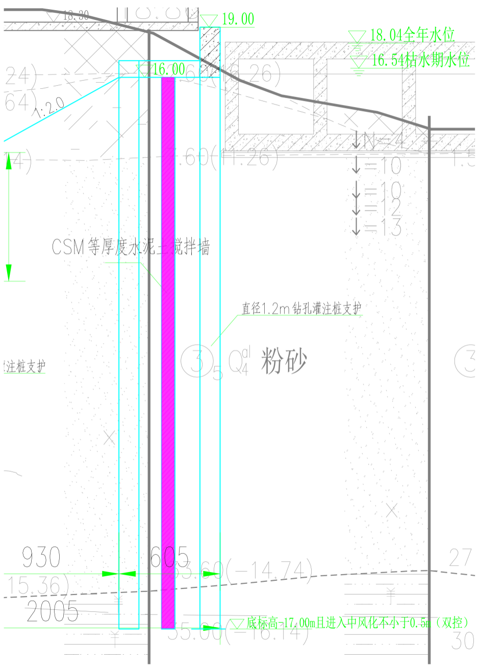 泵站基坑工程重要性等级为一级,防渗墙采用SMC工法施工,墙厚800mm,墙体进入中风化岩层0.5m,有效墙长33m,基坑普挖深度6.75m~16.20m,其中泵站区域开挖达18.50m。
